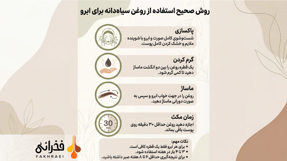 - ماساژ: روغن را در جهت خواب ابرو و سپس به صورت دورانی ماساژ دهید.